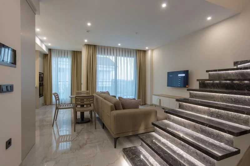 100 m² genişliğindeki Superior Suite odaları, hem aileler hem de çiftler için ideal bir konaklama deneyimi sunar. Geniş oturma odası, balkon veya terası, tam donanımlı mutfağı ve işlevsel alanlarıyla hem uzun hem kısa süreli konaklamalara uygundur. Havuz veya bahçe manzarası eşliğinde huzurlu bir atmosfer sunar.